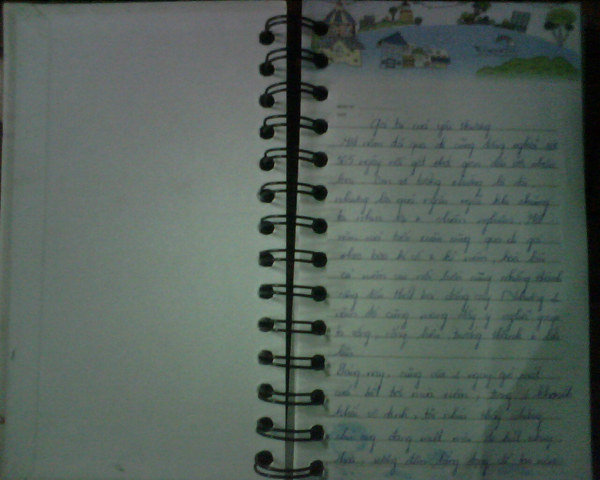 . Lại nhớ hôm qua đi chơi với cái khoai ngố , dẫn nó vô quán chè Hoa Phượng ăn kem thì nó hok ăn, 2 anh em ngồi nhìn nhau cười đến khi kem chảy hết rồi 2 anh em lại đi lượn đường gần 2 h . Đến 5h30 chở nhok về đến nhà, nhok đưa cho mình 2 cuốn vở và 1 cuốn sổ, bảo mình chọn lấy 1 , mình chọn cuốn sổ , hehe, vì trông nó đẹp lắm . Đang định mở ra xem có gì hay thì nhok bắt mình về nhà mới được mở ra xem nếu hok sẽ gặp xúi. Khổ quá, mình vốn tò mò sẵn, chờ nhok vào trong nhà mở ra xem ké tí trang đầu , đọc được vài dòng “Giá trị của yêu thương …..” thì gập lại luôn rồi về nhà. . Đi đến cầu quay, mình đã đi từ từ thế mà cái anh zai đằng sau còn húc vào xe mình , làm mình tý nữa thì bắn xuống sông, may mà mời đọc 1 tý trong cuốn sổ , nếu đọc hết chắc mình hok còn mạng về nhà mất
