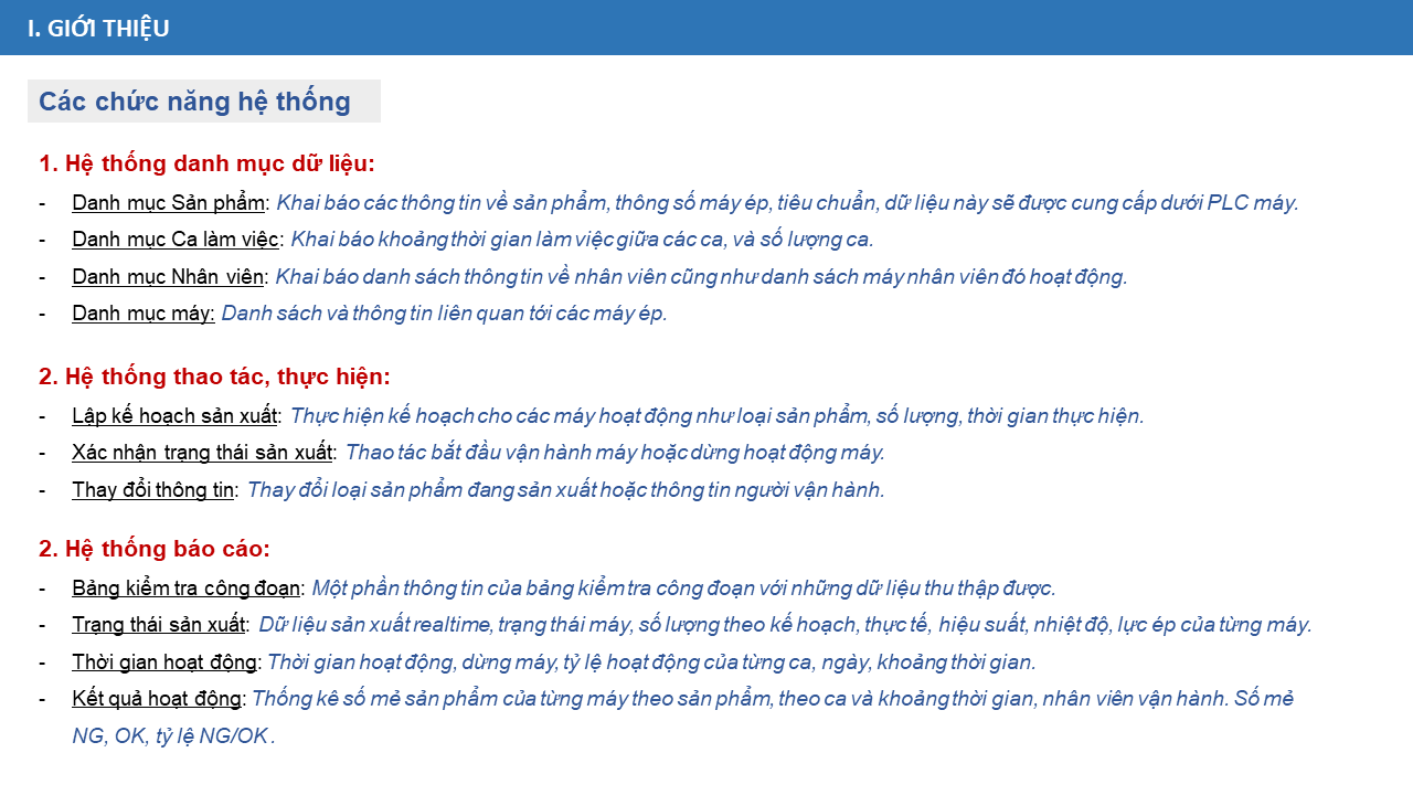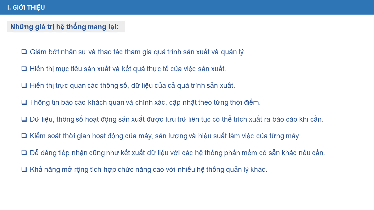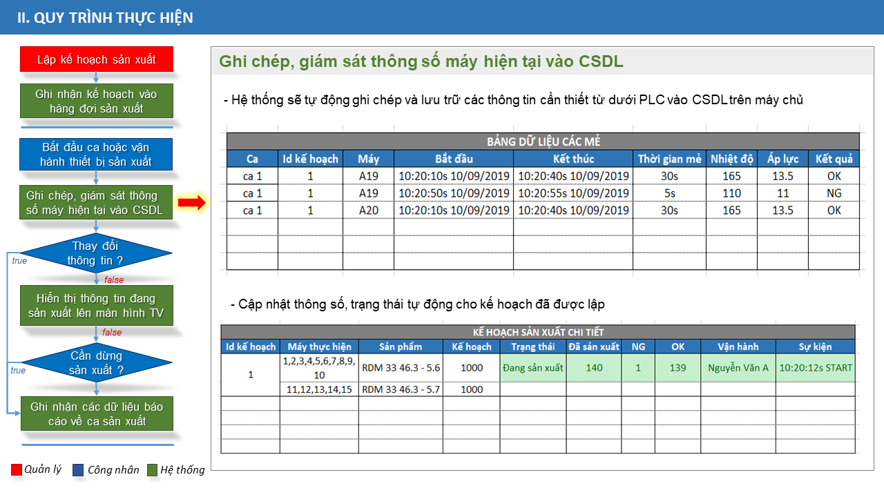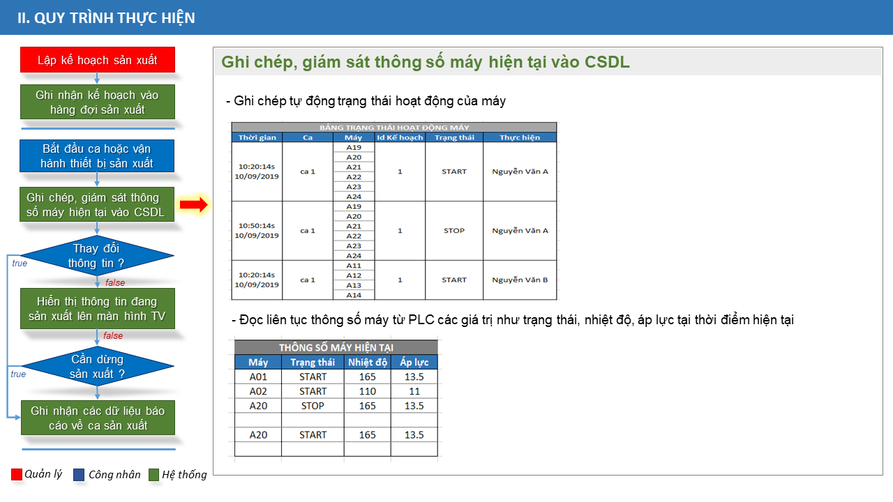 - Dữ liệu, thông số hoạt động sản xuất được lưu trữ liên tục có thể trích xuất ra báo cáo khi cần.