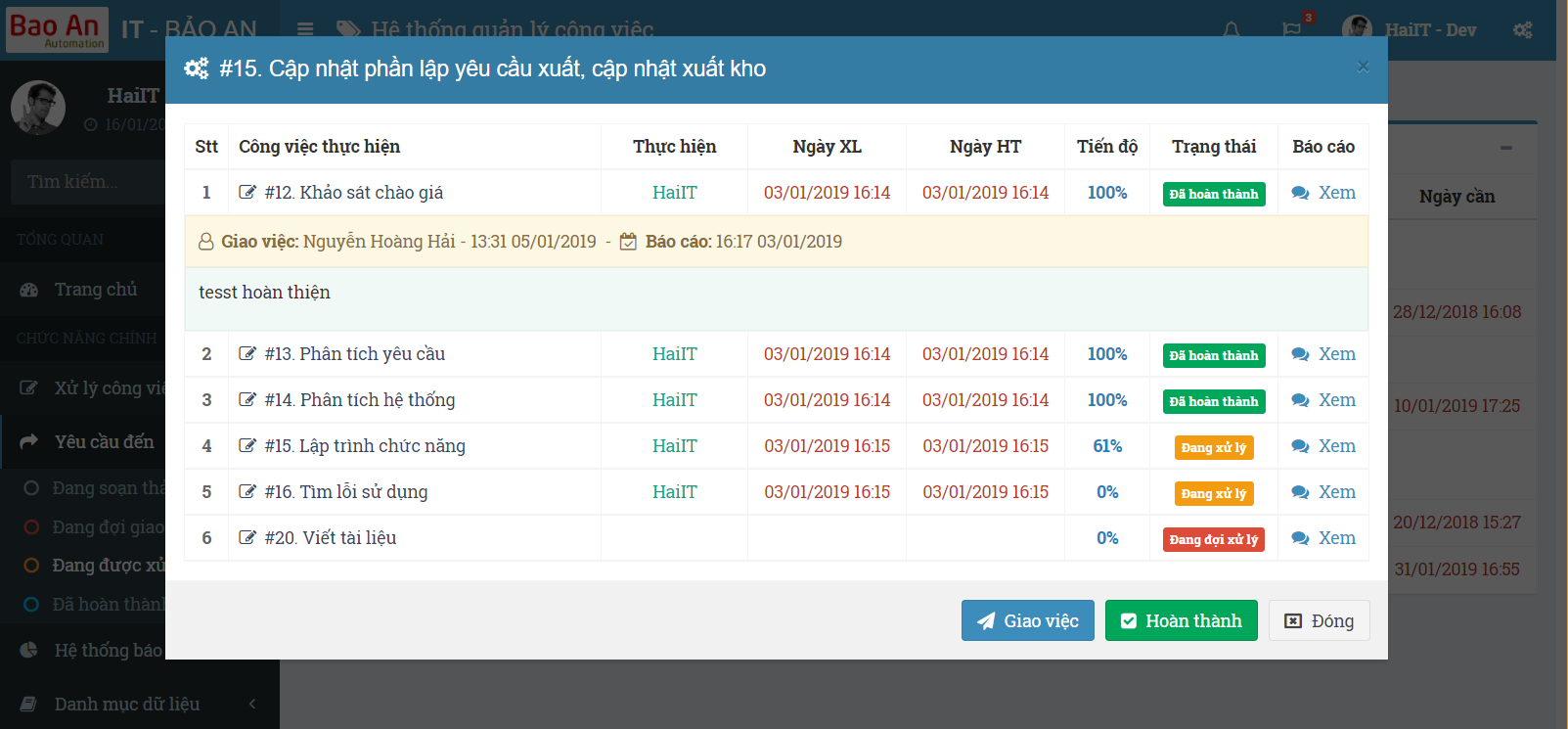 Nội dung báo cáo tiến độ của từng yêu cầu đến