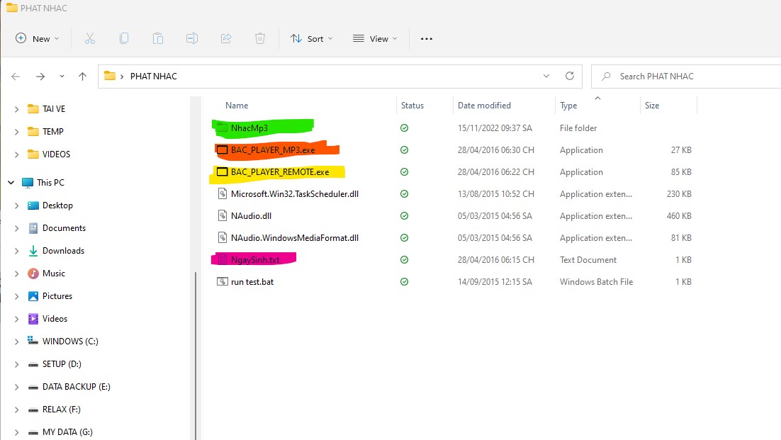 NgaySinh.txt: File text chứa danh sách ngày sinh, Nếu ngày hệ thống hiện tại có trong danh sách này thì chương trình sẽ tự động phát bài hát HappyBirthDay.mp3 có trong folder NhacMp3