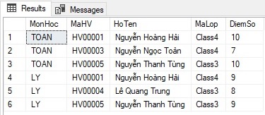 SELECT A.MonHoc,A.MaHV,B.HoTen,B.MaLop,A.DiemSo FROM DIEM_THI A LEFT OUTER JOIN HOC_VIEN B ON A.MaHV = B.MaHV -- Hoặc có thể viết tắt -- SELECT A.MonHoc,A.MaHV,B.HoTen,B.MaLop,A.DiemSo FROM DIEM_THI A LEFT JOIN HOC_VIEN B ON A.MaHV = B.MaHV
