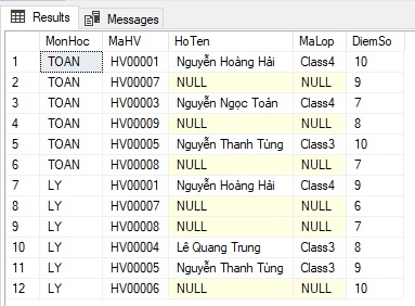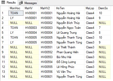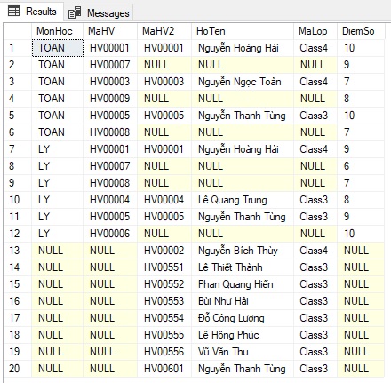 SELECT A.MonHoc,A.MaHV,B.MaHV MaHV2,B.HoTen,B.MaLop,A.DiemSo FROM DIEM_THI A FULL OUTER JOIN HOC_VIEN B ON A.MaHV = B.MaHV -- Hoặc có thể viết tắt -- SELECT A.MonHoc,A.MaHV,B.MaHV MaHV2,B.HoTen,B.MaLop,A.DiemSo FROM DIEM_THI A FULL JOIN HOC_VIEN B ON A.MaHV = B.MaHV