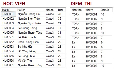 VD: Chúng ta có 2 bảng HOC_VIEN (A) và DIEM_THI (B) như dưới đây: