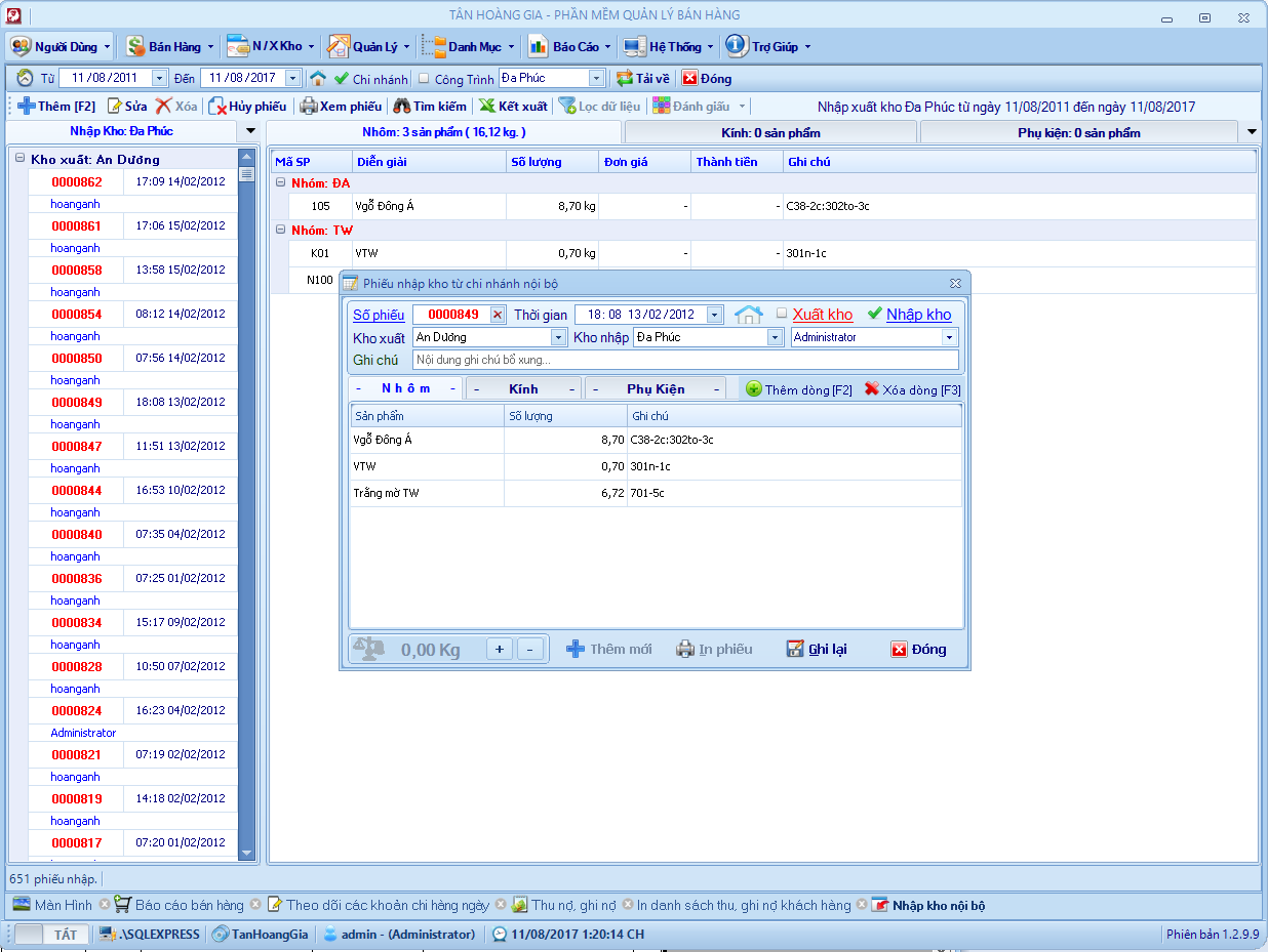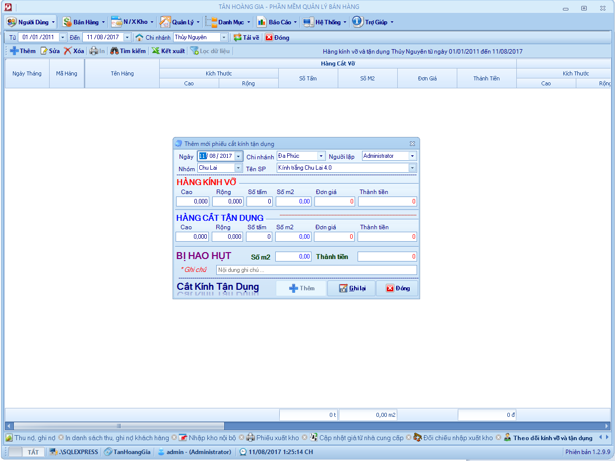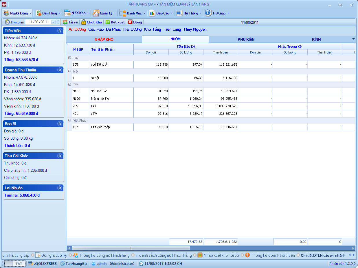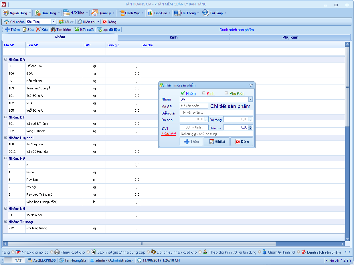 Đây là phần mềm mình viết hồi năm 2013, chương trình quản lý bán hàng cho cửa hàng nhôm kính. Hệ thống gồm 6 – 8 chi nhánh ở các địa phương kết nối với nhau thông qua 1 máy chủ SQL. Chương trình phân quyền mặc định mỗi chi nhánh tương ứng với một kho và chỉ sử dụng dữ liệu của kho đó, kho tổng sẽ toàn quyền với dữ liệu, xem dữ liệu bán hàng, tồn kho, nhập xuất, lợi nhuận vv .. của các kho khác.