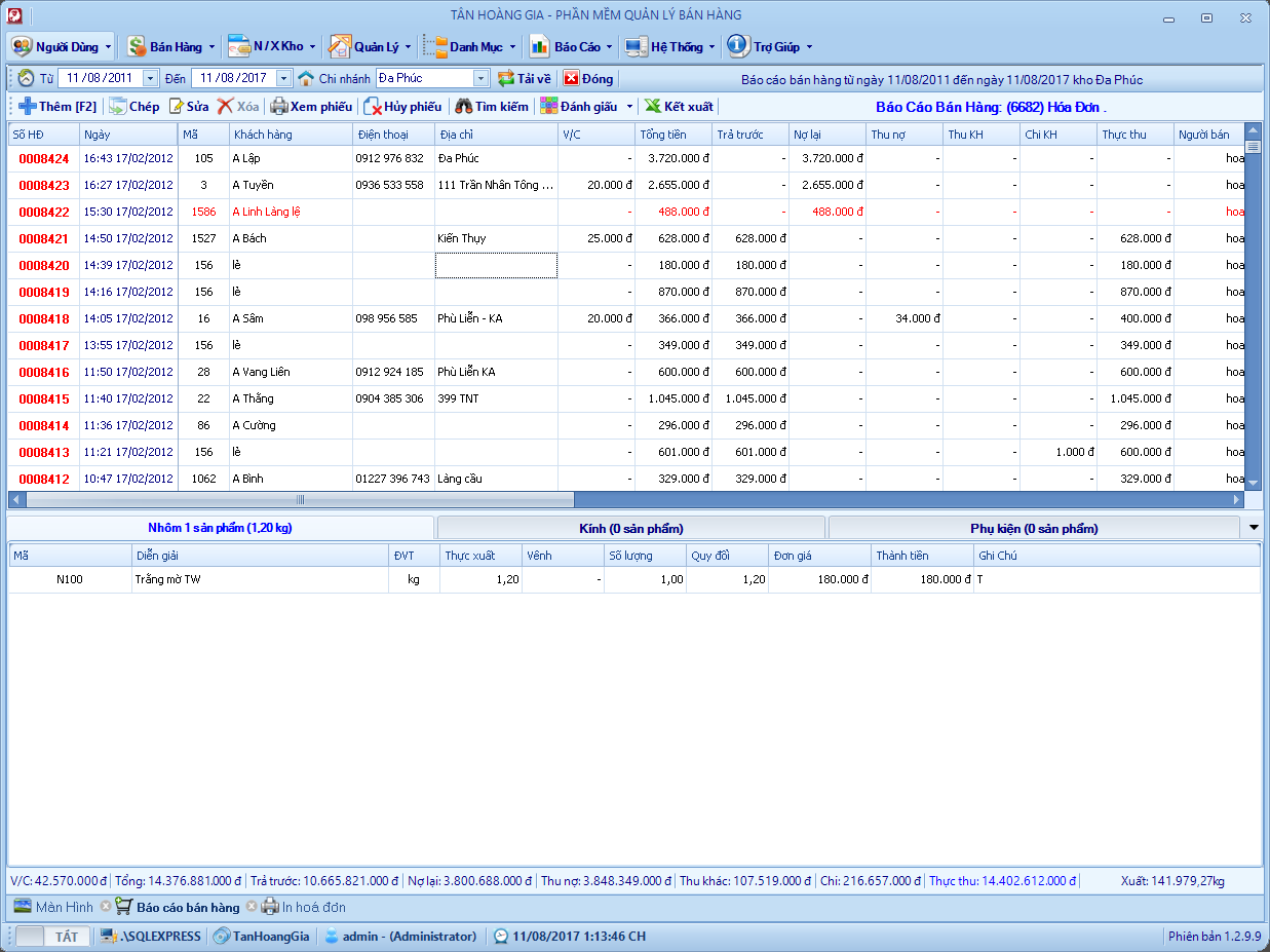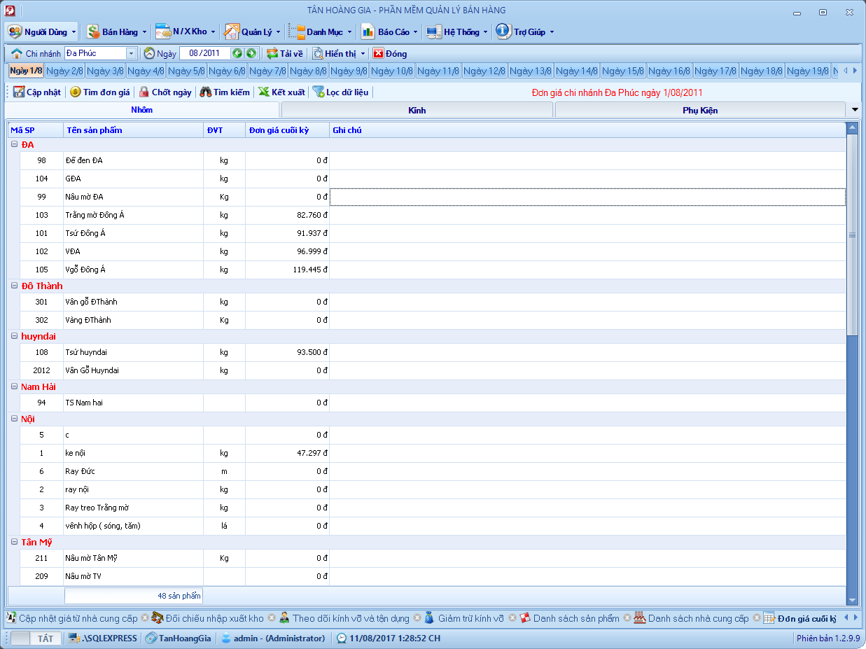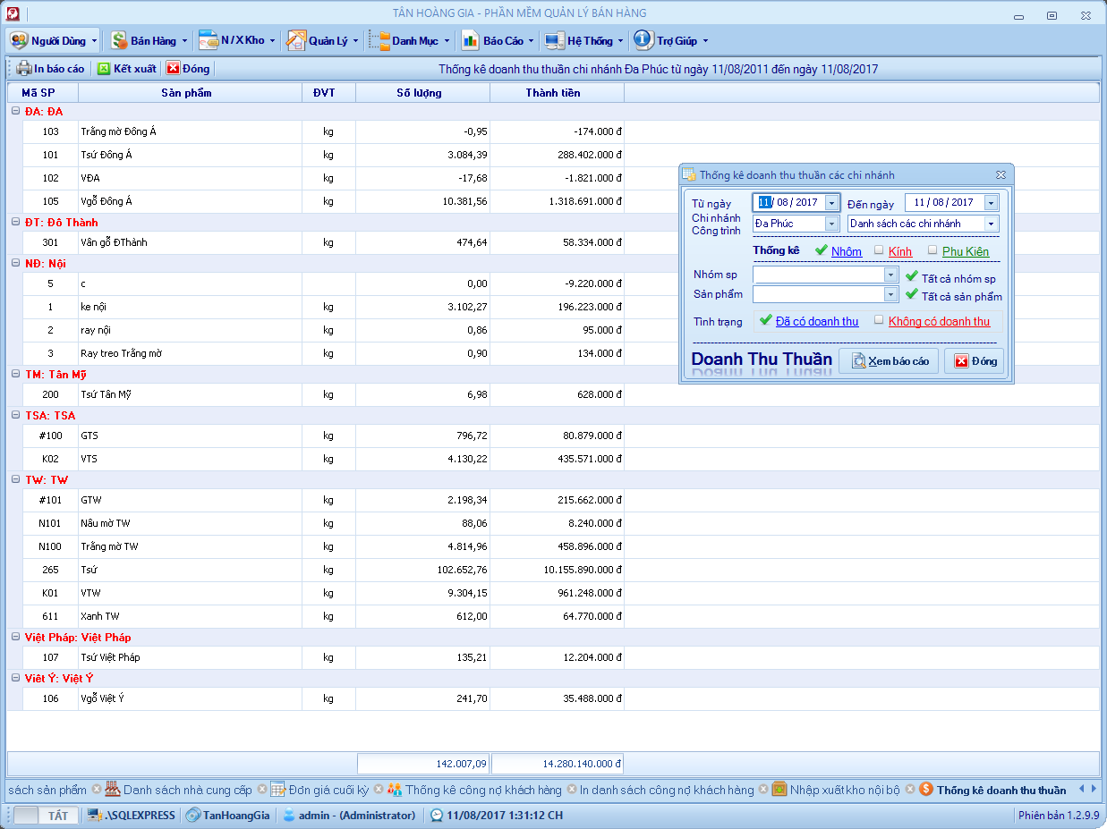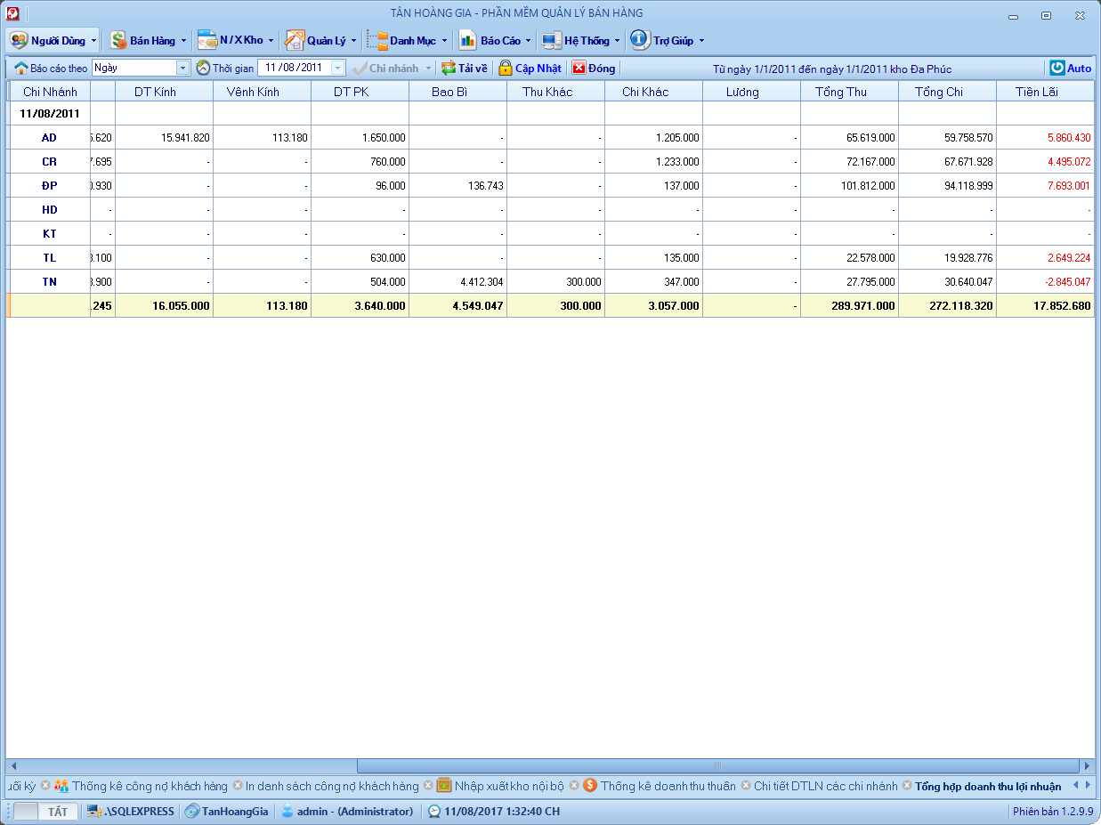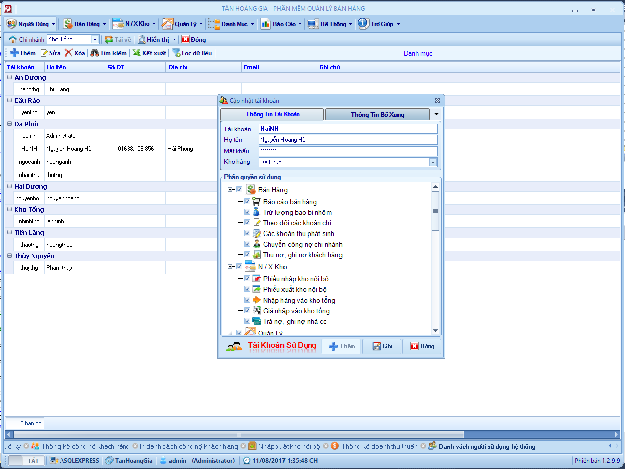 Đây là phần mềm mình viết hồi năm 2013, chương trình quản lý bán hàng cho cửa hàng nhôm kính. Hệ thống gồm 6 – 8 chi nhánh ở các địa phương kết nối với nhau thông qua 1 máy chủ SQL. Chương trình phân quyền mặc định mỗi chi nhánh tương ứng với một kho và chỉ sử dụng dữ liệu của kho đó, kho tổng sẽ toàn quyền với dữ liệu, xem dữ liệu bán hàng, tồn kho, nhập xuất, lợi nhuận vv .. của các kho khác.