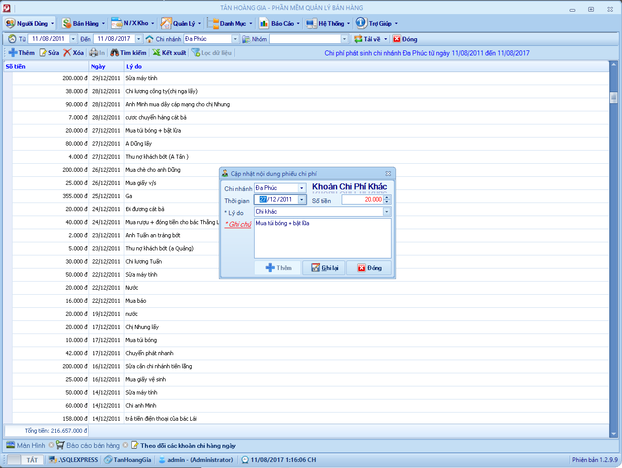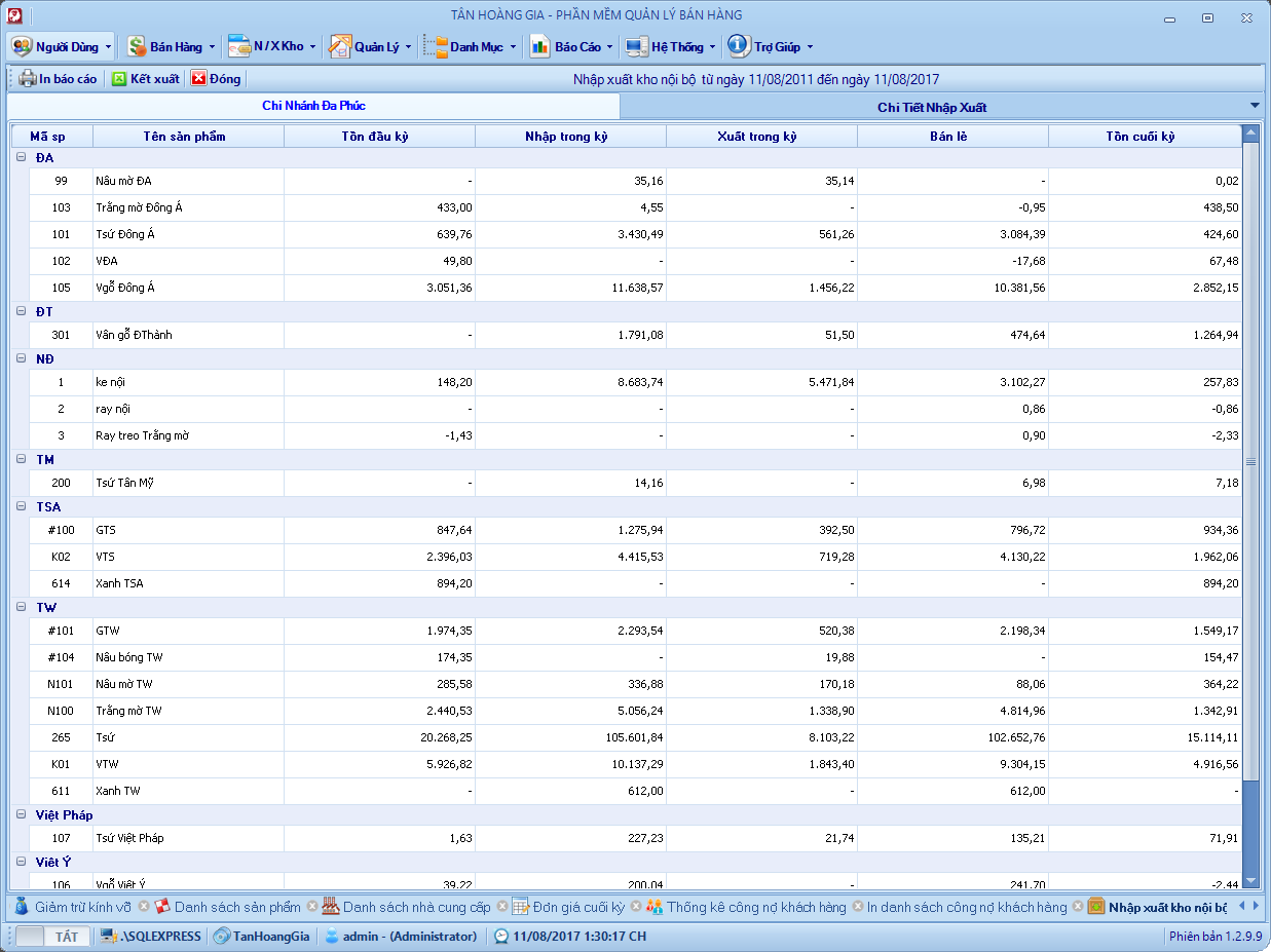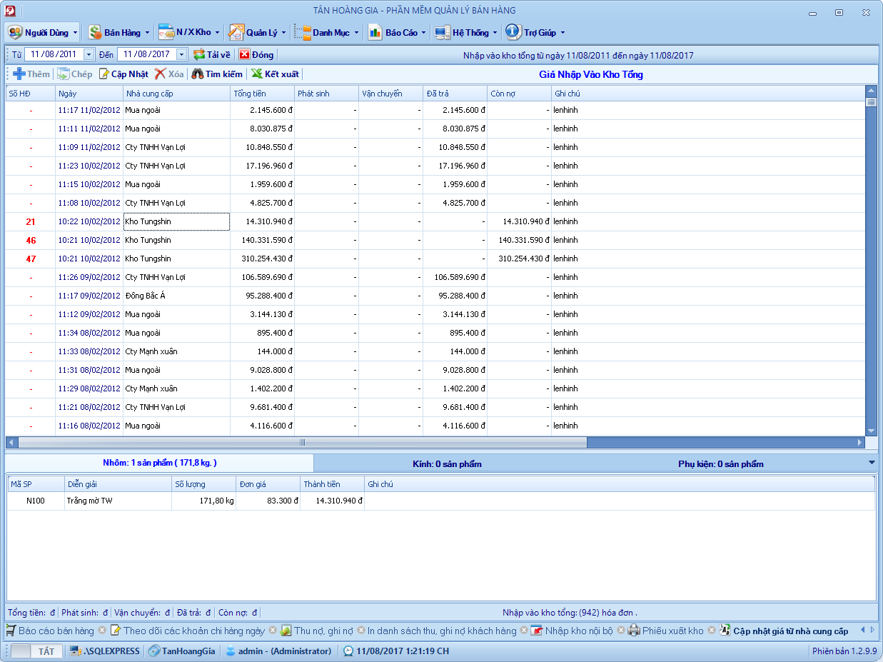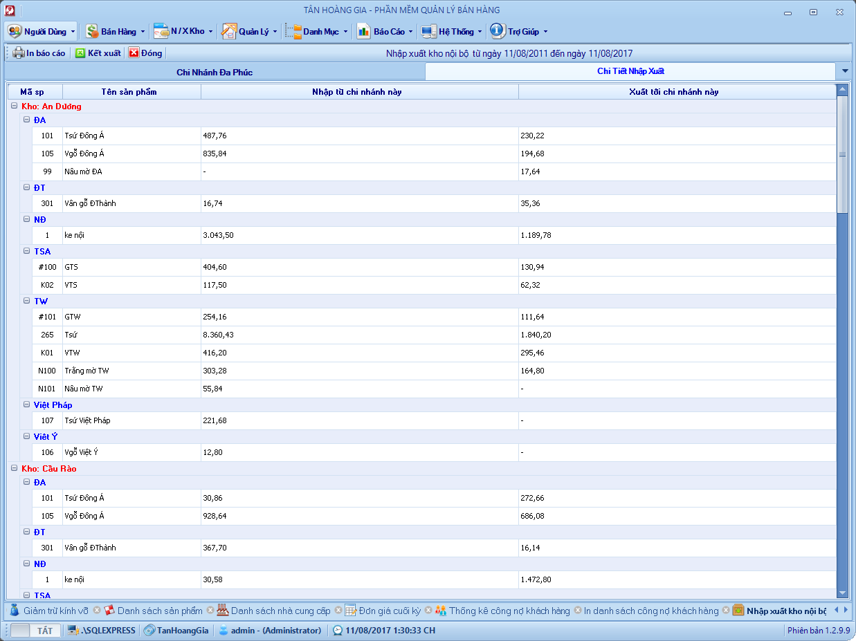 Đây là phần mềm mình viết hồi năm 2013, chương trình quản lý bán hàng cho cửa hàng nhôm kính. Hệ thống gồm 6 – 8 chi nhánh ở các địa phương kết nối với nhau thông qua 1 máy chủ SQL. Chương trình phân quyền mặc định mỗi chi nhánh tương ứng với một kho và chỉ sử dụng dữ liệu của kho đó, kho tổng sẽ toàn quyền với dữ liệu, xem dữ liệu bán hàng, tồn kho, nhập xuất, lợi nhuận vv .. của các kho khác.