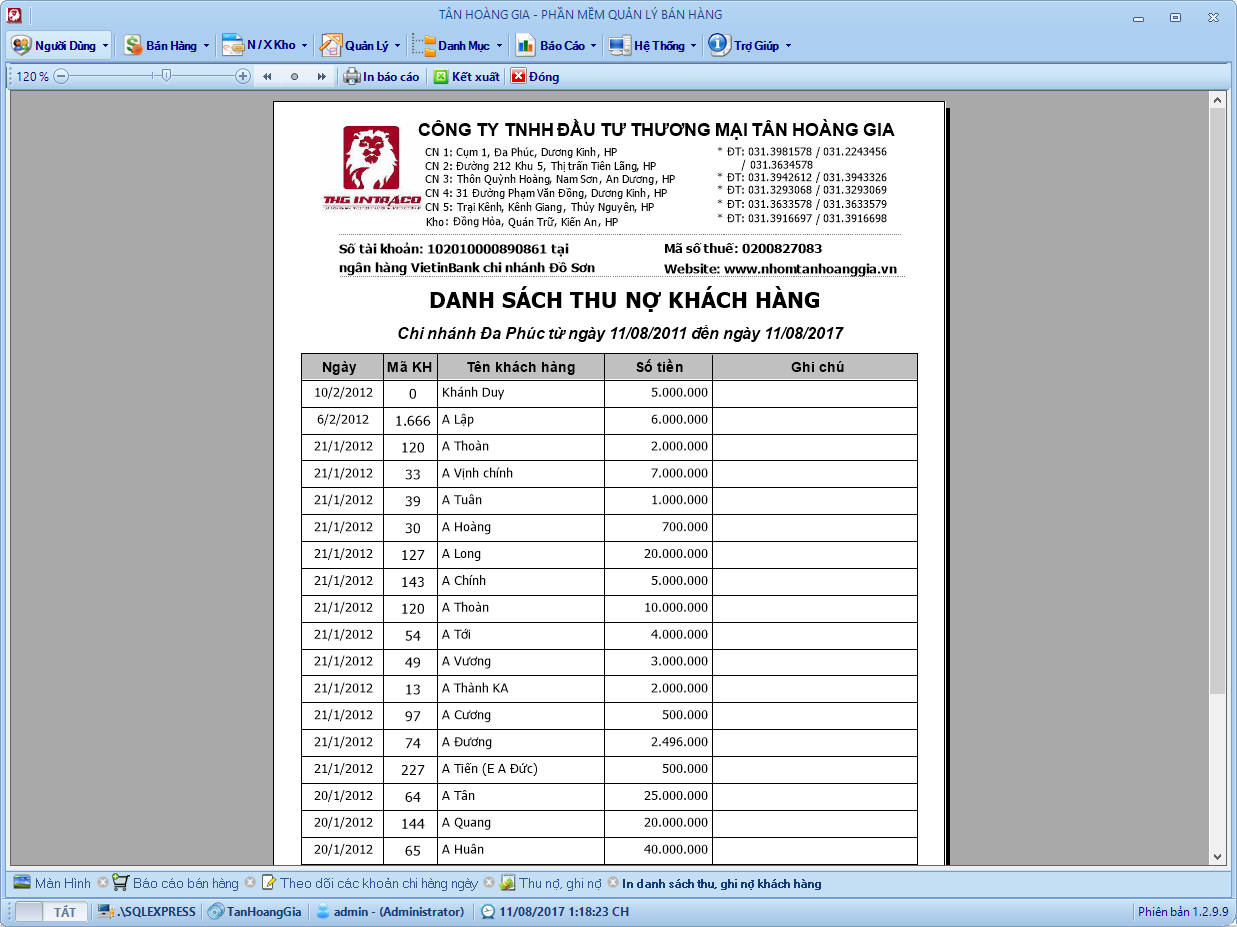 Bảng danh sách công nợ khách hàng