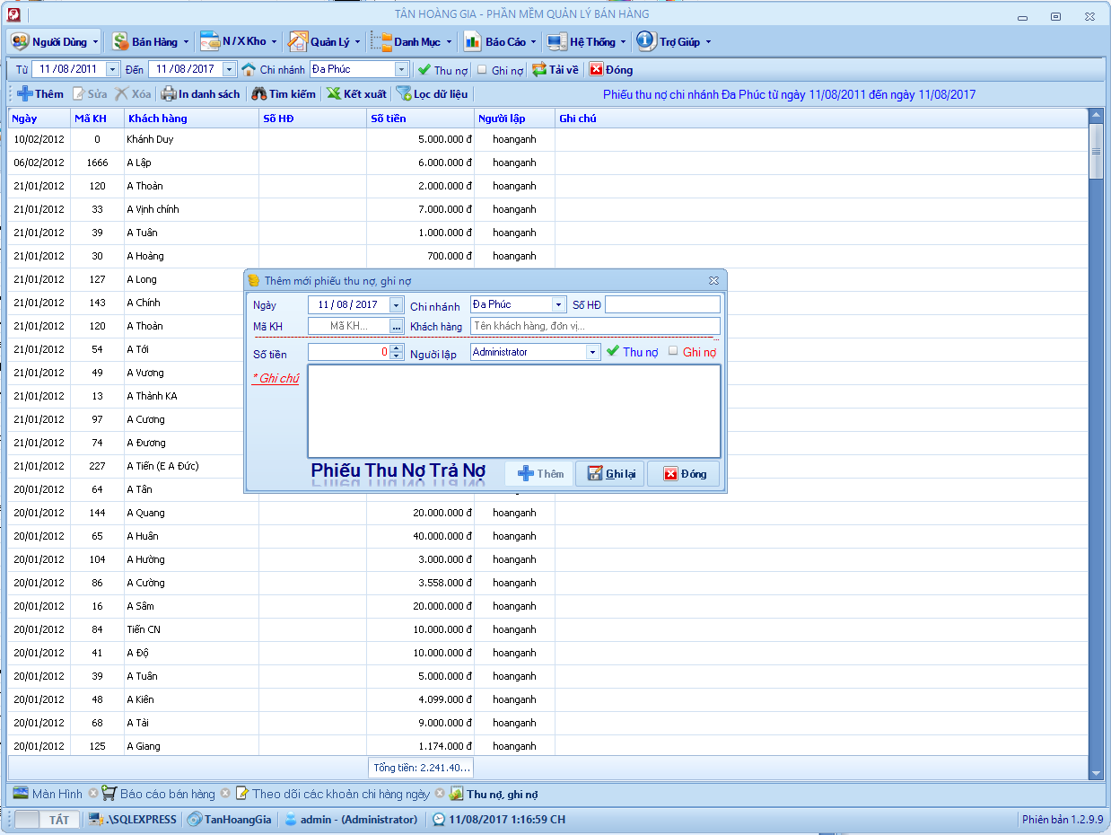 Bảng cập nhật thu nợ và ghi nợ