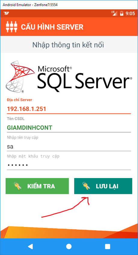 Màn hình cấu hình thông tin kết nối SQL SERVER