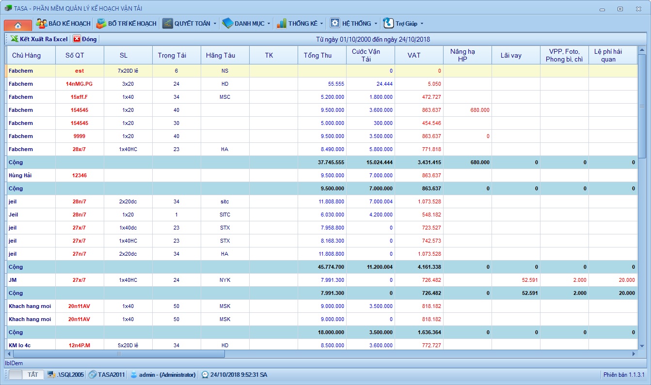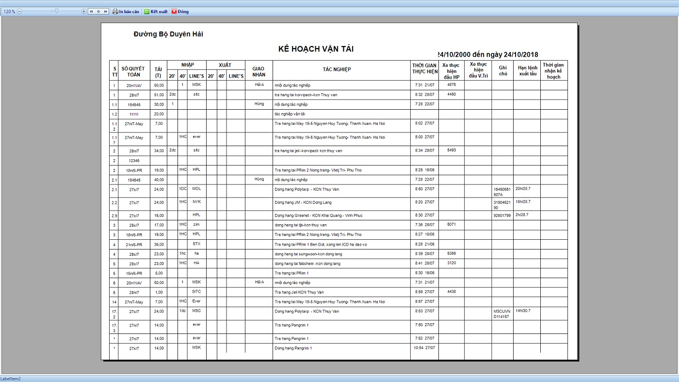 Bảng in danh sách kế hoạch vận tải
