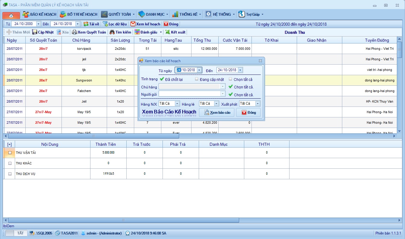 Nhập các khoản thu liên quan đến mỗi kế hoạch, hiện tại có 3 khoản thu là: Thu vận tải, Thu khác, Thu dịch vụ