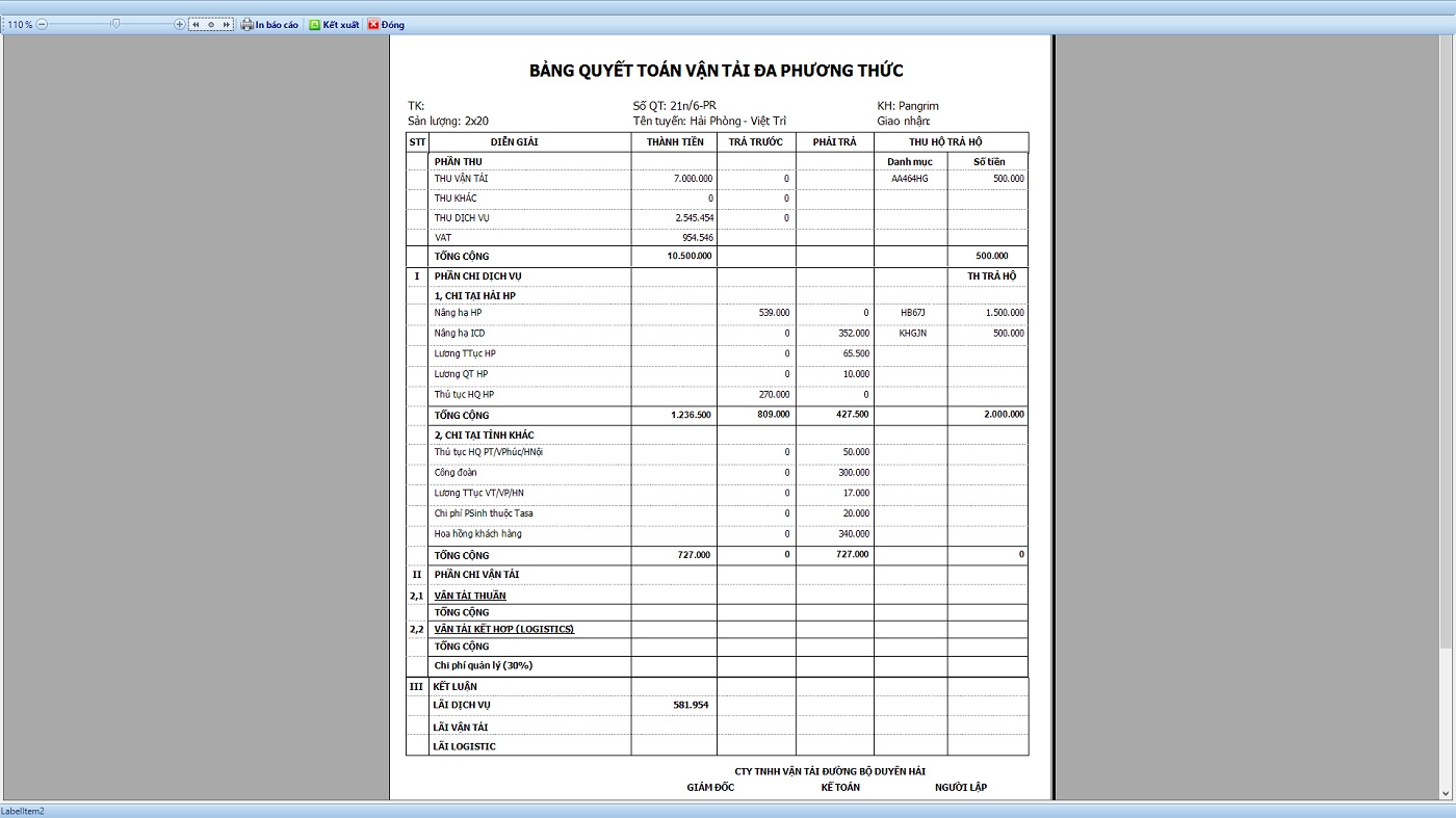 Màn hình in bảng quyết toán vận tải của mỗi kế hoạch