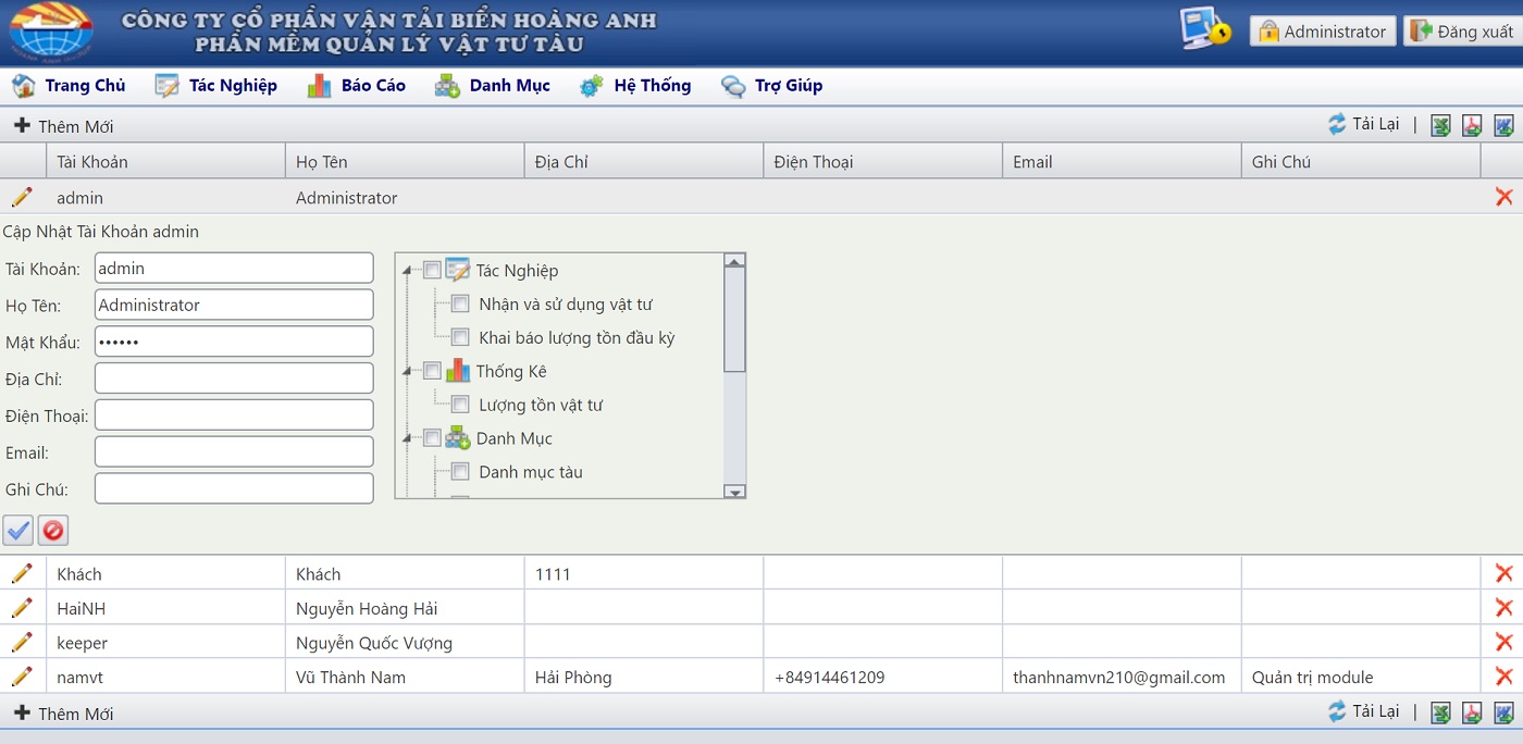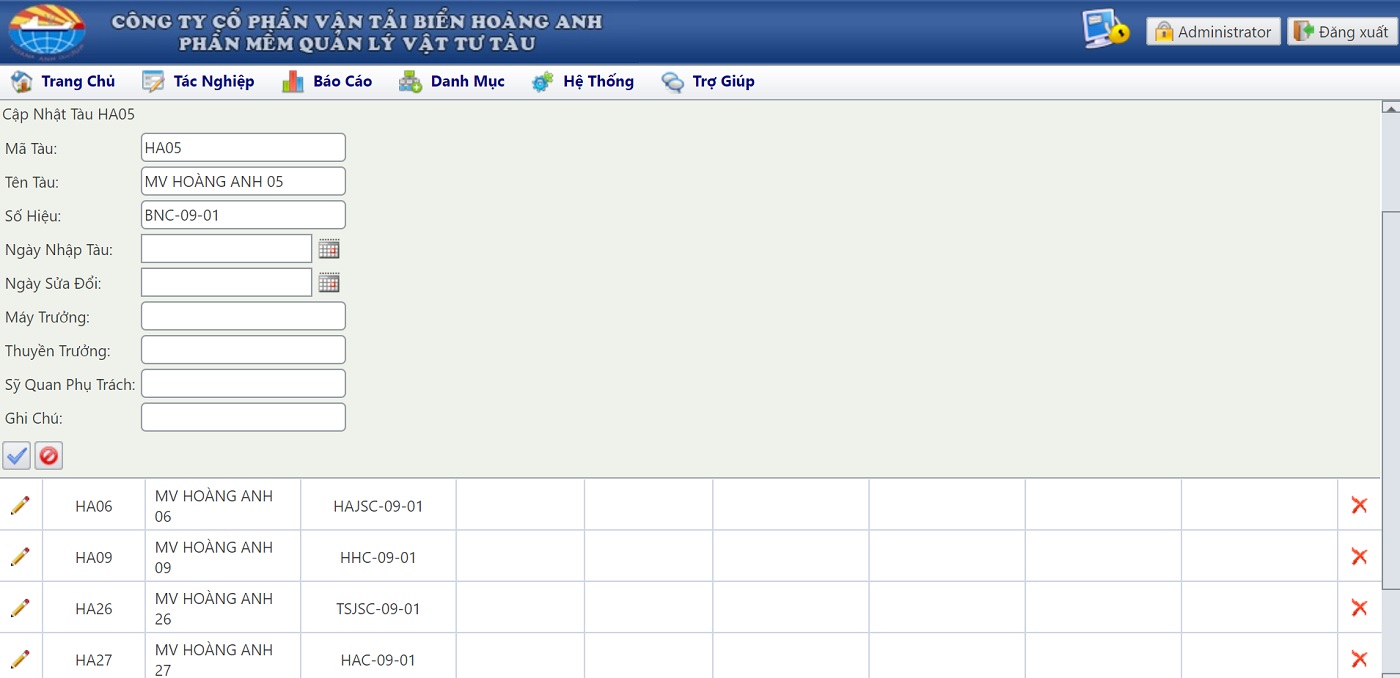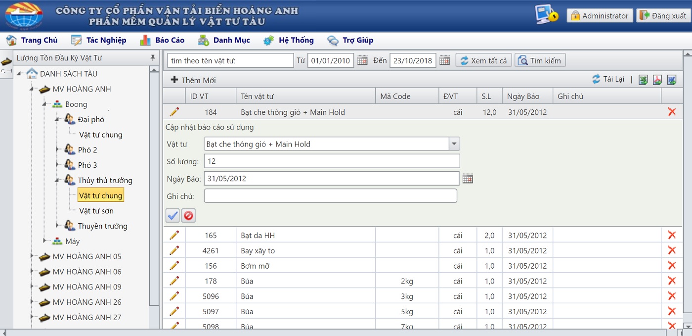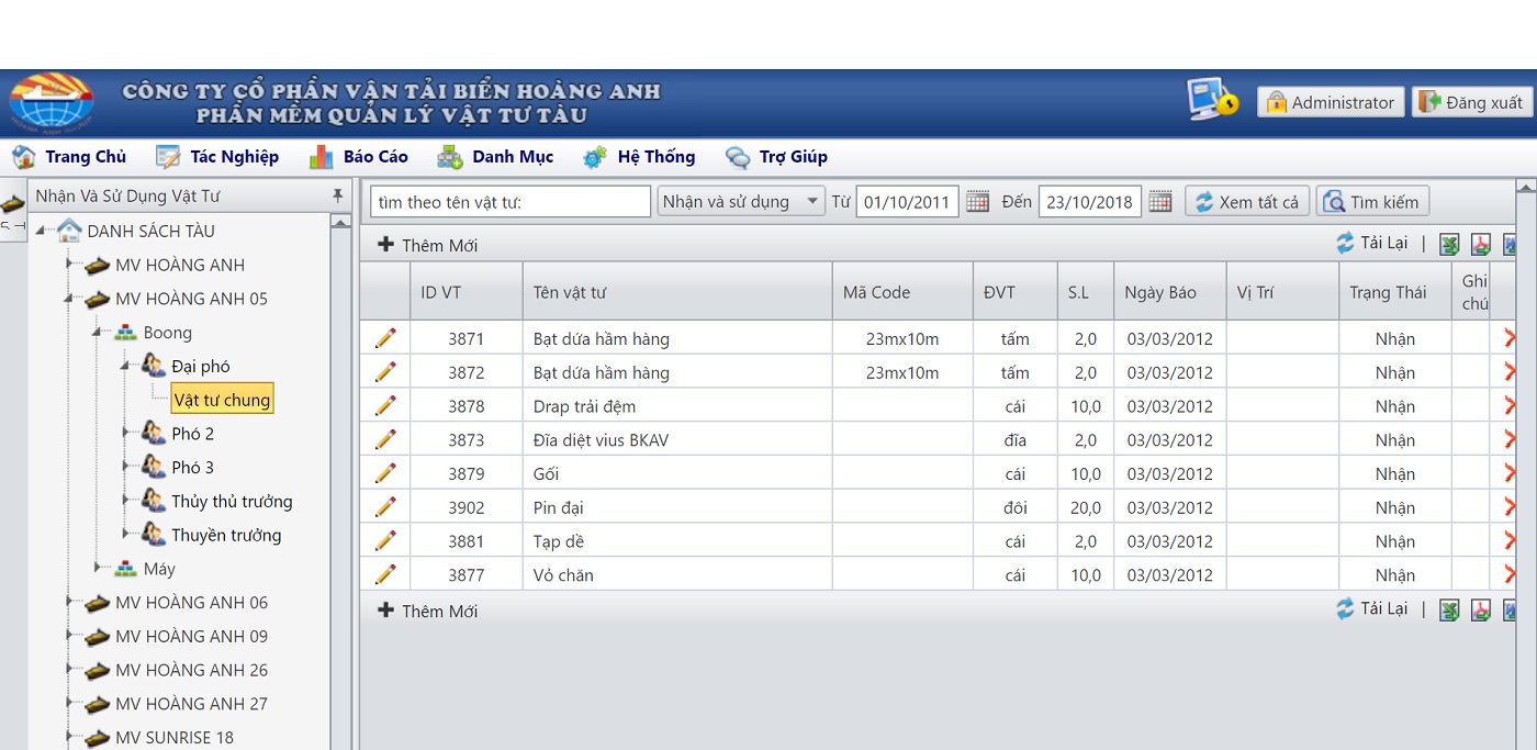 Đây là phần mềm quản lý đầu tiên mình viết trên nền web khi còn làm ở công ty năm 2012. Chương trình này có chức năng chính quản lý thiết bị vật tư trên tàu theo từng vị trí như khai báo nhận và sử dụng, báo cáo tồn vật tư. Chương trình được viết bằng asp.net VB.NET MSSQL.