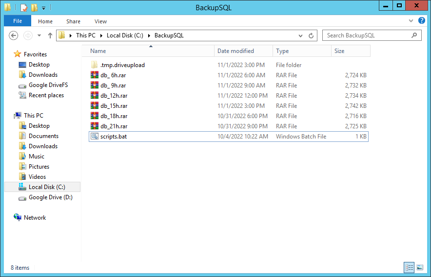 Tạo file .BAT có nội dung như trên và lưu vào 1 folder “C:\BackupSQL\scripts.bat”, các bạn thay đổi đường dẫn thì tùy. Nếu muốn thêm bước nén file thì sử dụng nội dung file .BAT dưới đây.