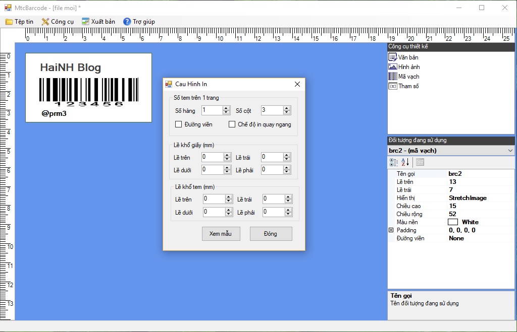 Đây là chương trình mình viết hồi năm 2012, chương trình có chức năng thiết kế mẫu tem barcode, nhập dữ liệu và kết nối tới máy in để in hàng loạt tem theo thứ tự. Chương trình này mình viết bằng vb.net
