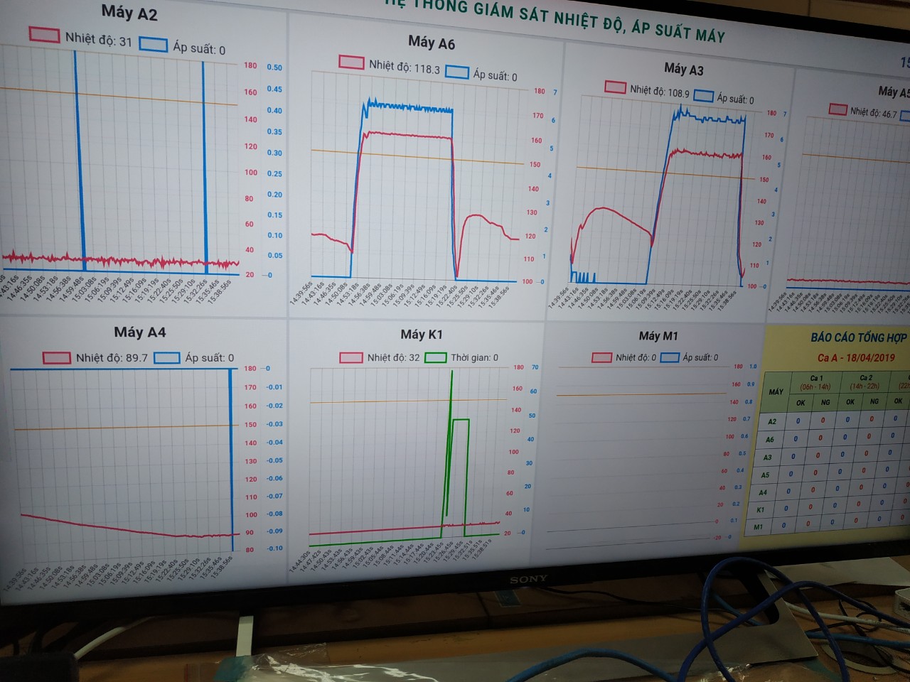 Hệ thống giám sát nhiệt độ và áp suất các máy móc sản xuất trong nhà máy. Ghi chép số liệu và cảnh báo NG, OK trong ca sản xuất.