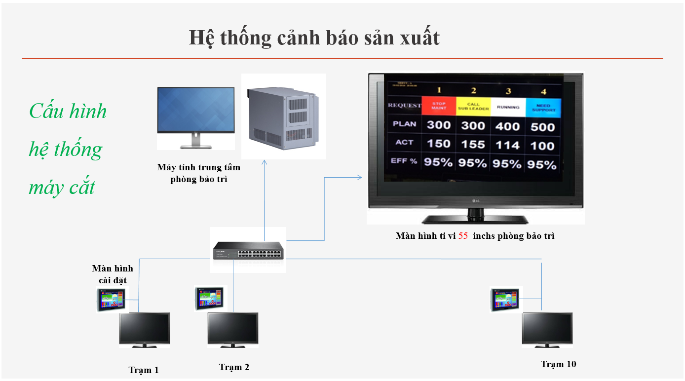 Giải pháp này sử dụng hệ thống các nút bấm và màn hình hiển thị thông báo khi cần thông báo cũng như kết quả sản xuất Cấu Hình Bảng Điều Khiển Khi chọn vào ô trang màn hình, có thể đánh số trang mà mình muốn xem => Enter Khi chọn 1 máy, màn...
