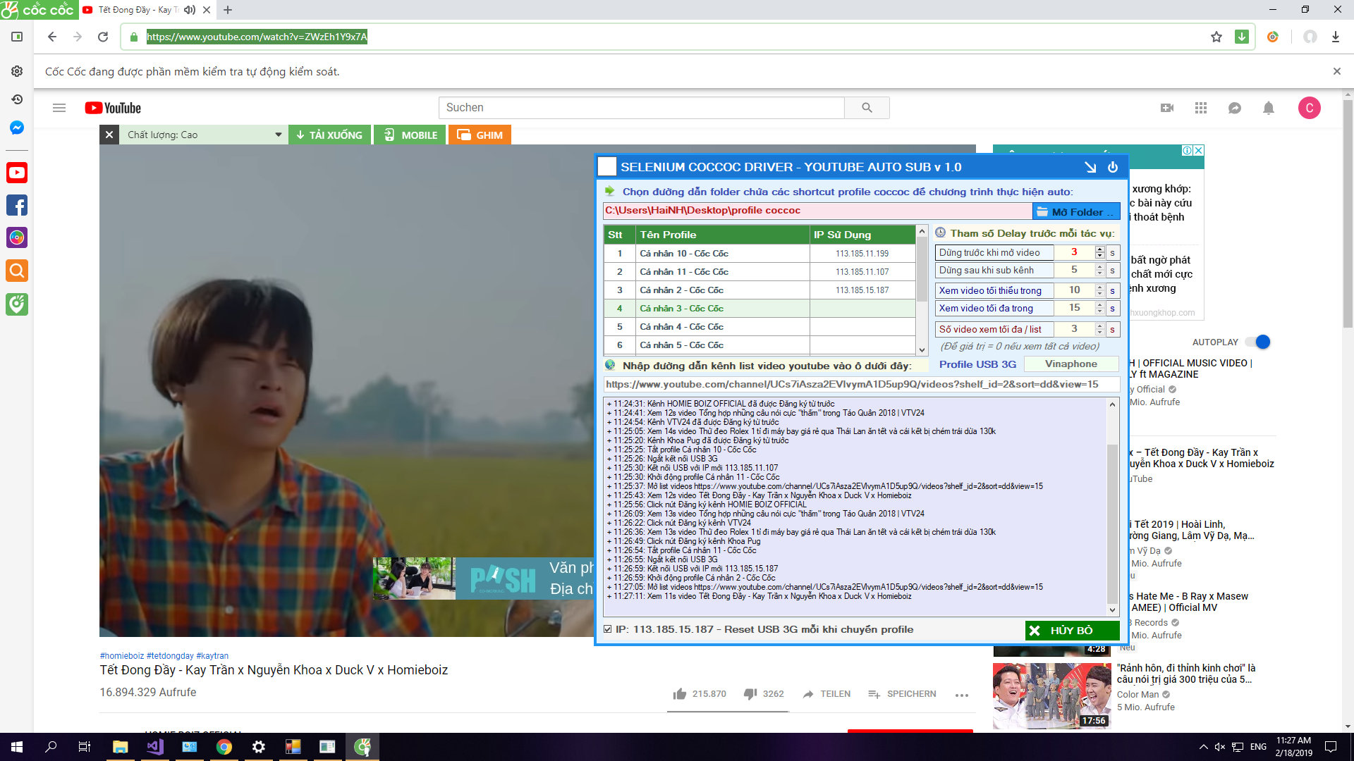 Chương trình có chức năng auto thực hiện theo kịch bản như: + Load folder chứa các shortcut coccoc để nạp các profile coccoc vào list + Mở cococc duyệt qua danh sách các profile đó và mở list video youtube + Xem từng video có trong danh sách đó theo thời gian cài đặt...