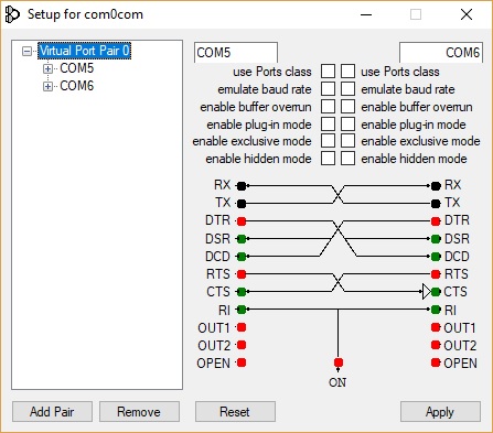 Khi cài xong mình Remove đi hết và bấm Add Pair 1 lần để tạo Virtual Port Pair 0, Tại 2 ô textbox bên phải bạn đánh tên 2 cổng COM muốn giả lập, ở đây mình nhập COM5 và COM6, 2 cổng này mắc nối tiếp nhau như vậy khi tín hiệu được gửi đến 1 trong 2 cổng thì nó sẽ được đẩy tiếp sang cổng kia. Trong trường hợp này mình sẽ để COM5 là cổng giả lập để chương trình của mình kết nối đến nó và đọc giá trị, trong khi đó thì COM6 sẽ nhận giá trị từ 1 chương trình khác có chức năng Send giá trị cho nó và chuyển tiếp đến COM5. Ở đây mình sẽ sử dụng chương trình terminal để giả lập các giá trị tín hiệu gửi đến.