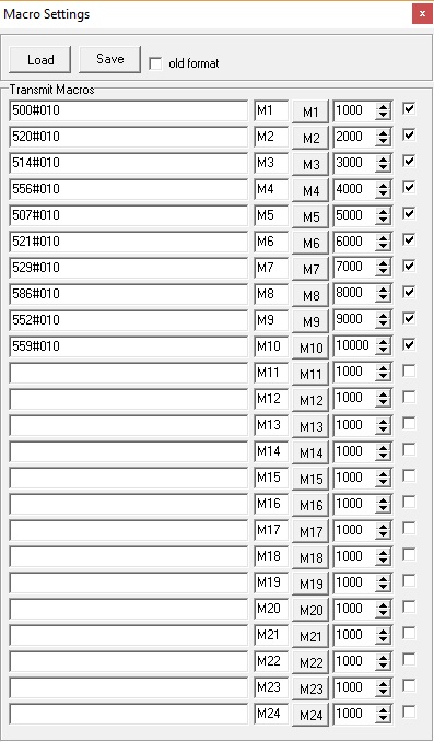 Chương trình cho phép tối đa 24 dòng, ở đây mình giả lập giá trị trong 10 ô đầu từ 500 – 600 tại ô Transmit Macrco, ký tự #010 là dấu xuống dòng, Giá trị sau các ô M1-M21 là thời gian đợi để gửi giá trị ô đó, sử dụng ô nào chỉ việc tick vào ô check cuối cùng.
