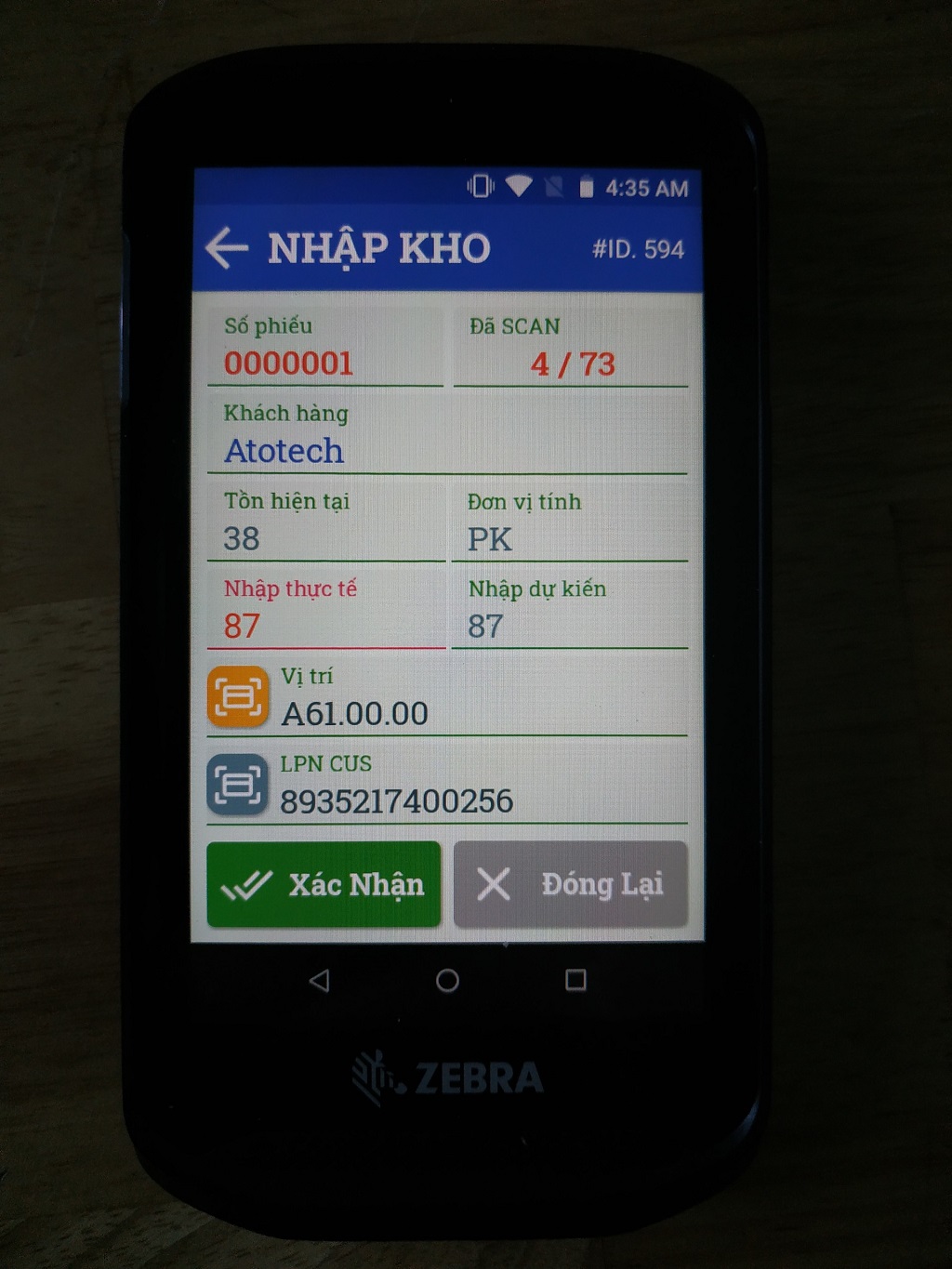 Nếu hệ thống phát hiện ra barcode đang có trong hàng đợi nhập kho đã được lập phiếu sẽ hiển thị nội dung để cập nhật một số thông tin như lượng thực tế nhập, vị trí, lpn, các thông tin này có thể dùng máy để quét barcode có in trên pallet hoặc package.