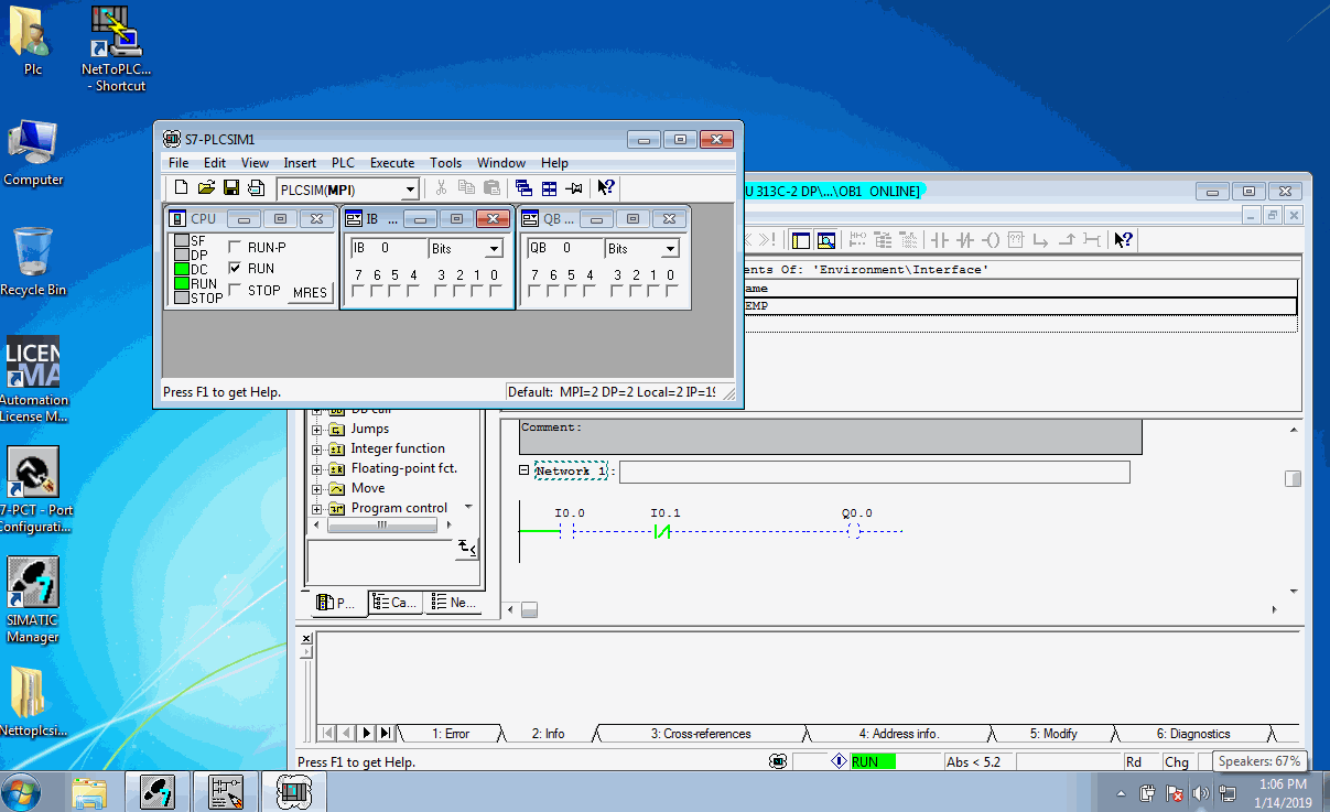 Bấm vào biểu tượng Download để đổ chương trình xuống PLC, và bấm biểu tượng Monitor để theo dõi giá trị tại cửa sổ OB1 và chọn RUN tại PLC-SIM, Bấm F2, F3 để hiển thị cửa sổ Input -> Output và xem kết quả: